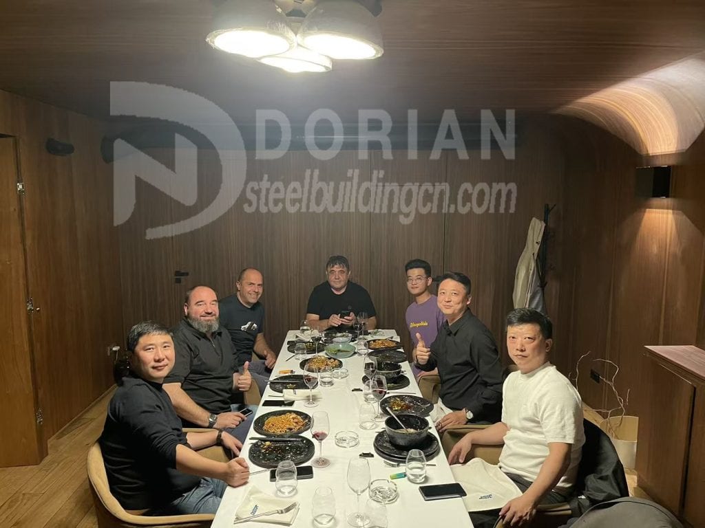 During the dining time, we also talked about many meaningful topics, such as Dorian’s factory in China, the services it can provide, and Luoyang city—the beautiful and peaceful city where Dorian’s factory is located. Besides providing steel structure, color steel sheet, sandwich panels, The factory can also supply including solar panels, batteries, cranes and other supporting equipments. For the prefabrication steel, we can ensure an output of about 3,000 tons monthly, which is really impressive for the clients.