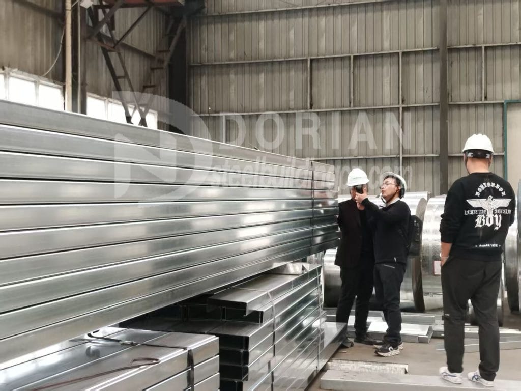 The production equipment and production line of main frame(steel columns and beams) was introduced to client firstly. After that, Dorian also took clients to visit secondary frame workshop, purline and panels workshop. He specifically inquired about the zinc content of the purlins. The zinc content what Dorian provided is normally 100g/m2, which meets the customer's requirements for the zinc content of purlins.