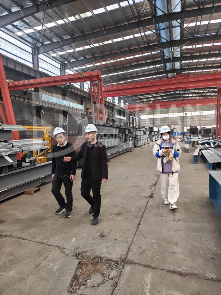 After client got the approval in early October and decided to visit Dorian factory. The client and his assistant arrived in Luoyang on the evening of October 19th. Dorian team took them to dinner and then dropped them off at the hotel. On the morning of October 20th, Dorian team picked clients up to factory for visiting. The whole factory covers about 110 thousand square meters and has five production lines, including many professional production equipment, like Flame cutting machine, Laser cutting machine, Assembly machine, Submerged arc welding machine, Straightening machine, Blasting machine, Environmental friendly painting room etc, which can meet various of production of massive span.