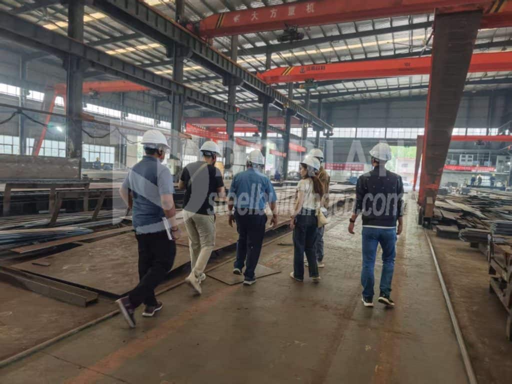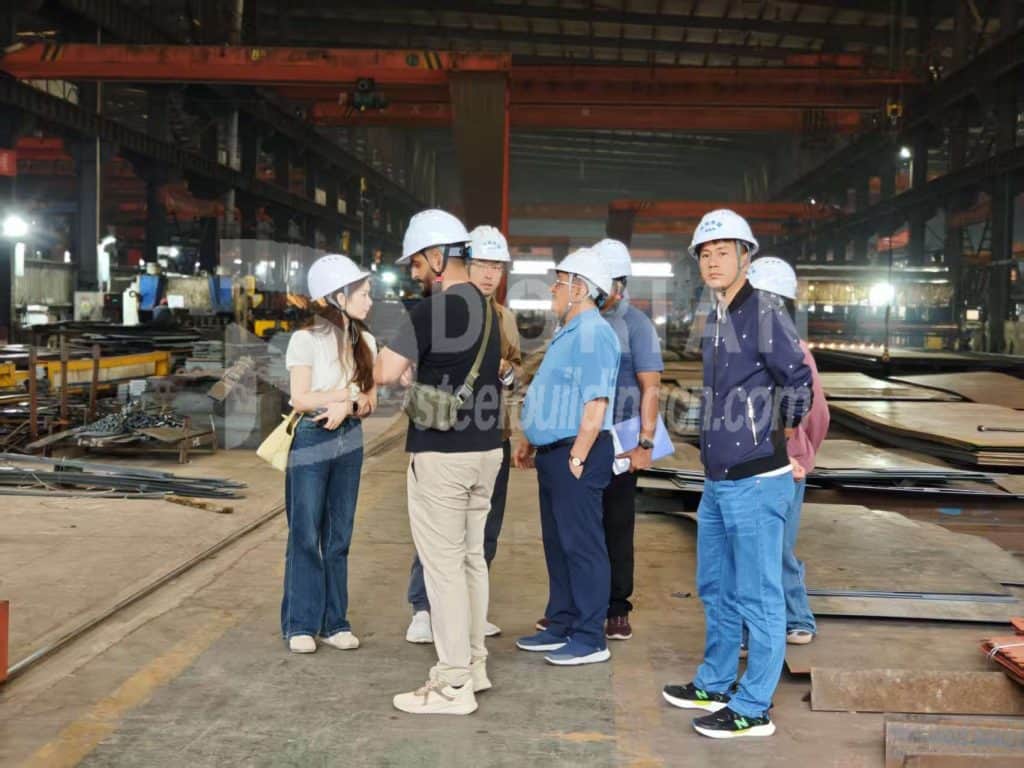 First, we took the client on a tour of the H-beam production workshop, which features a variety of production equipment, including laser cutting machines, flame cutting machines, fully automatic punching machines, shearing machines, drilling machines, submerged arc welding machines, straightening machines, shot blasting machines, and an environmentally friendly paint room, all designed to meet the client's diverse production needs.