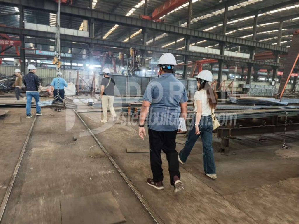 After discussing all the project details, the Dorian team took the client to the production workshop. Dorian factory covers a total area of 11,000 square meters and have five production lines, capable of meeting the client's diverse needs. In addition to producing standard steel structure warehouses and workshop, Dorian also support manufacture chicken house buildings, cattle sheds, sheep sheds, horse shed, commercial buildings, prefabricated houses, color-coated steel plates, composite panels, and more.