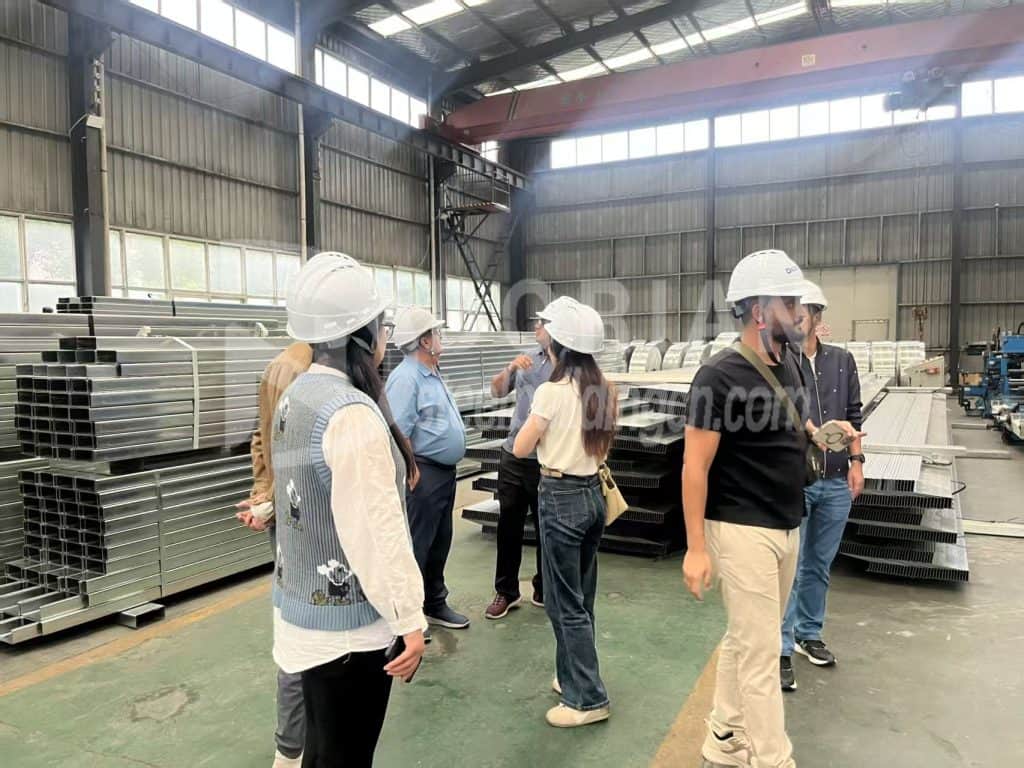 Afterwards, we took the customer to visit the color steel plate workshop, where we have professional tile presses, bending machines, purlin machines, and other equipment capable of producing C-section steel, Z-section steel, color plate, hemming, and other products.