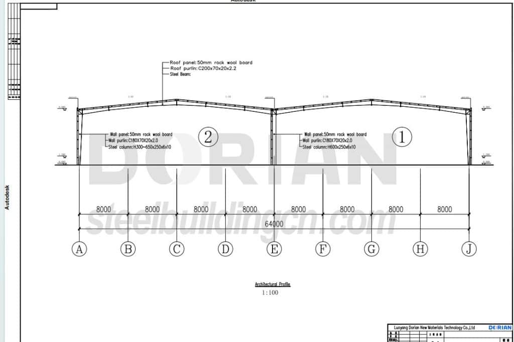 The detailed dimension of big project is 64*175*9m, Dorian engineer designed double span for 64m side, with 32m for each span. The whole building is respectly two phase, The first one will construct one span and then second phase. The 7m columns space for 175m side, 8m for 64m side considering the loading and economical issues. Since client mentioned that he prefer insulation materials, Dorian team suggested adopting rock wool sandwich panels as roof and wall, because he didn’t reveal that this project need cold storage rooms inside and other different division areas, so the whole project was designed based on a regular warehouse.